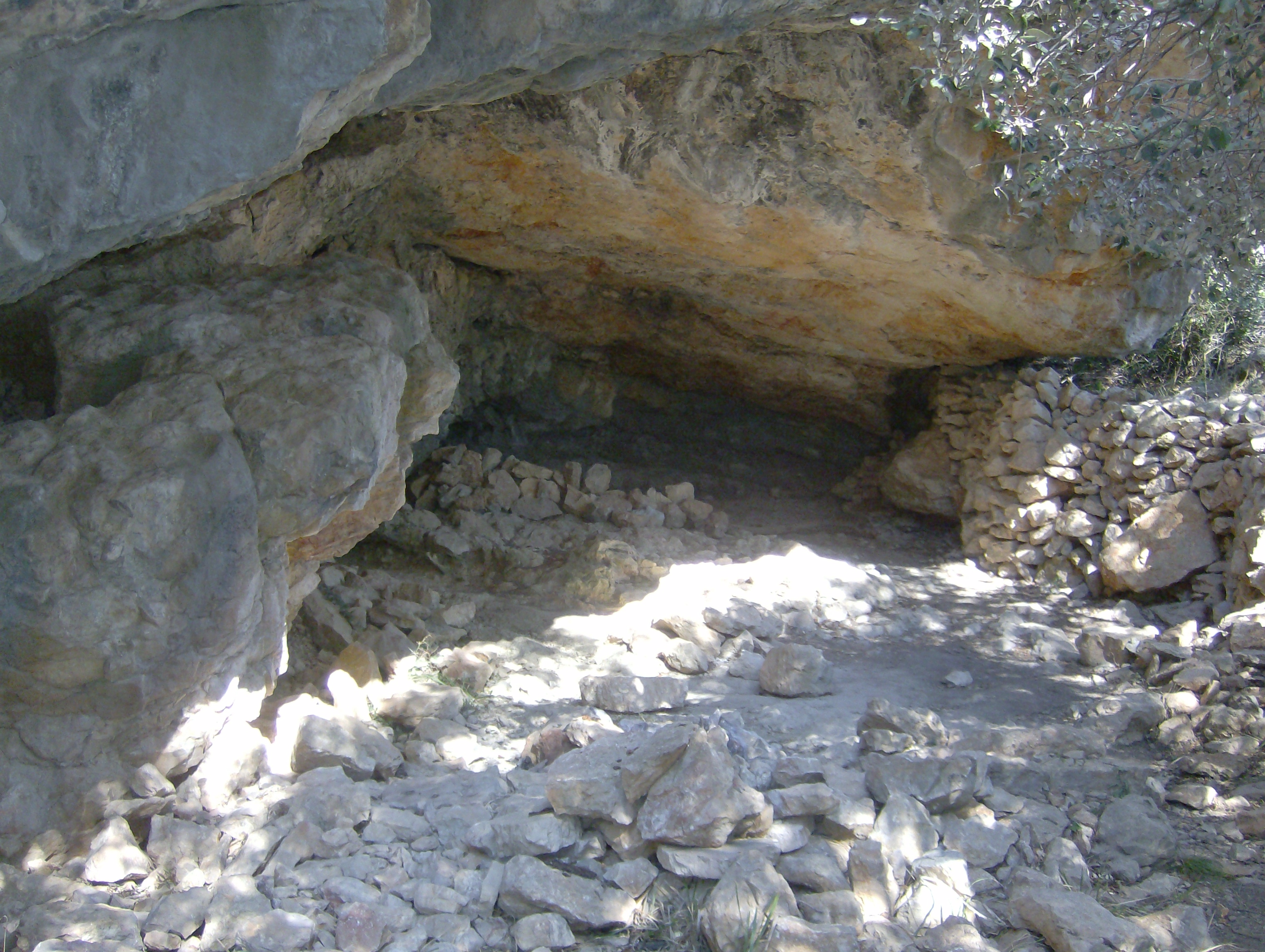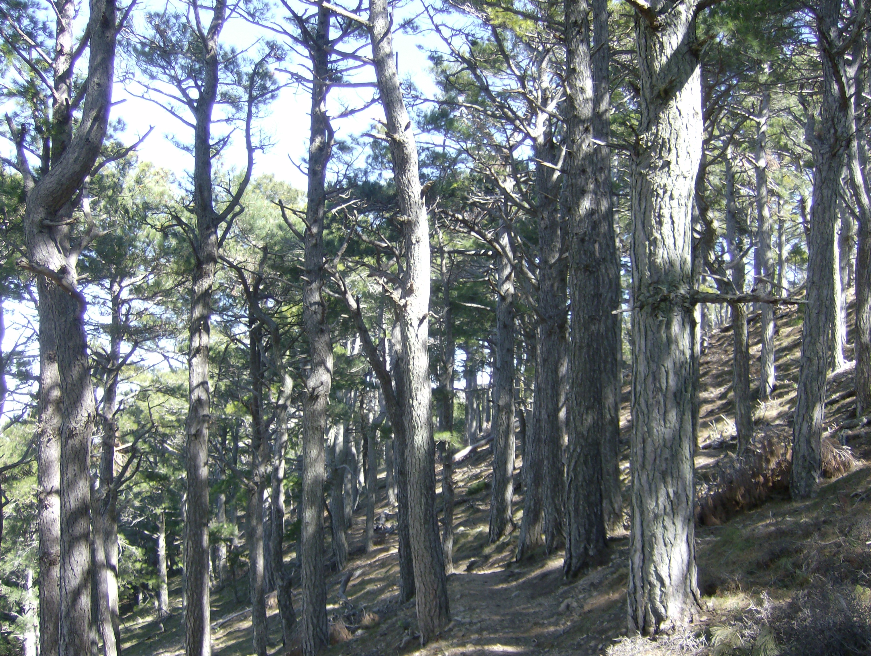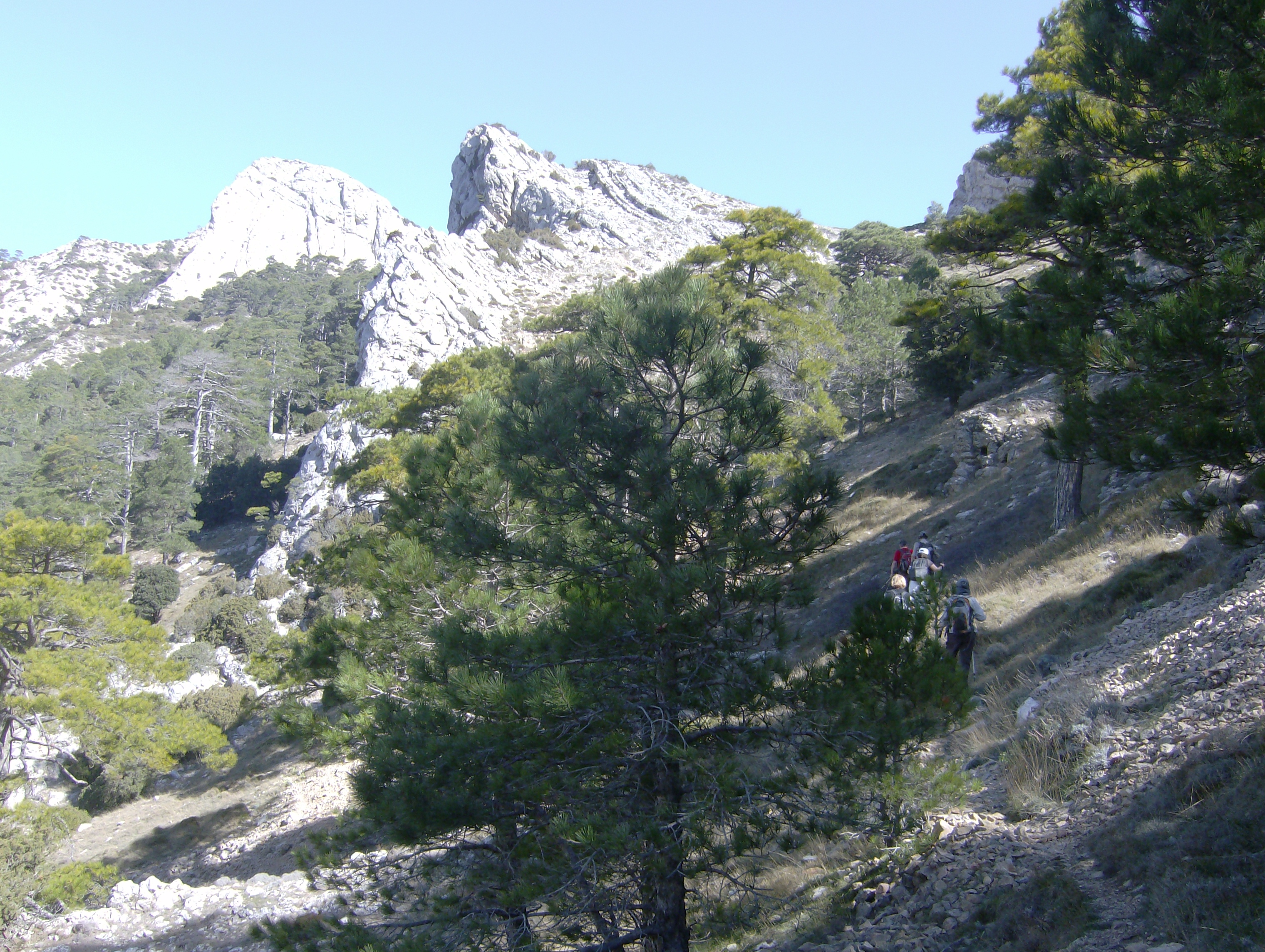 preciosa balma obrada amb aigua potable per refrescar-se i estris per fer-se una truita si convé (no portàvem els ingredients, però). La resta de la pujada fins al coll és el sender ideal: el fort desnivell per un ombrívol bosc de pins i alzines se supera amb un itinerari en ziga-zaga de terra tou i pendent moderat, que permet una marxa còmoda i regular a la mida de cadascú.